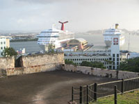| Puerto Rico - old San Juan at night | Big Budget - we even had chairs with our names on!! (That's irony my friends) | San Juan - cruise ships dock below the castle walls |
